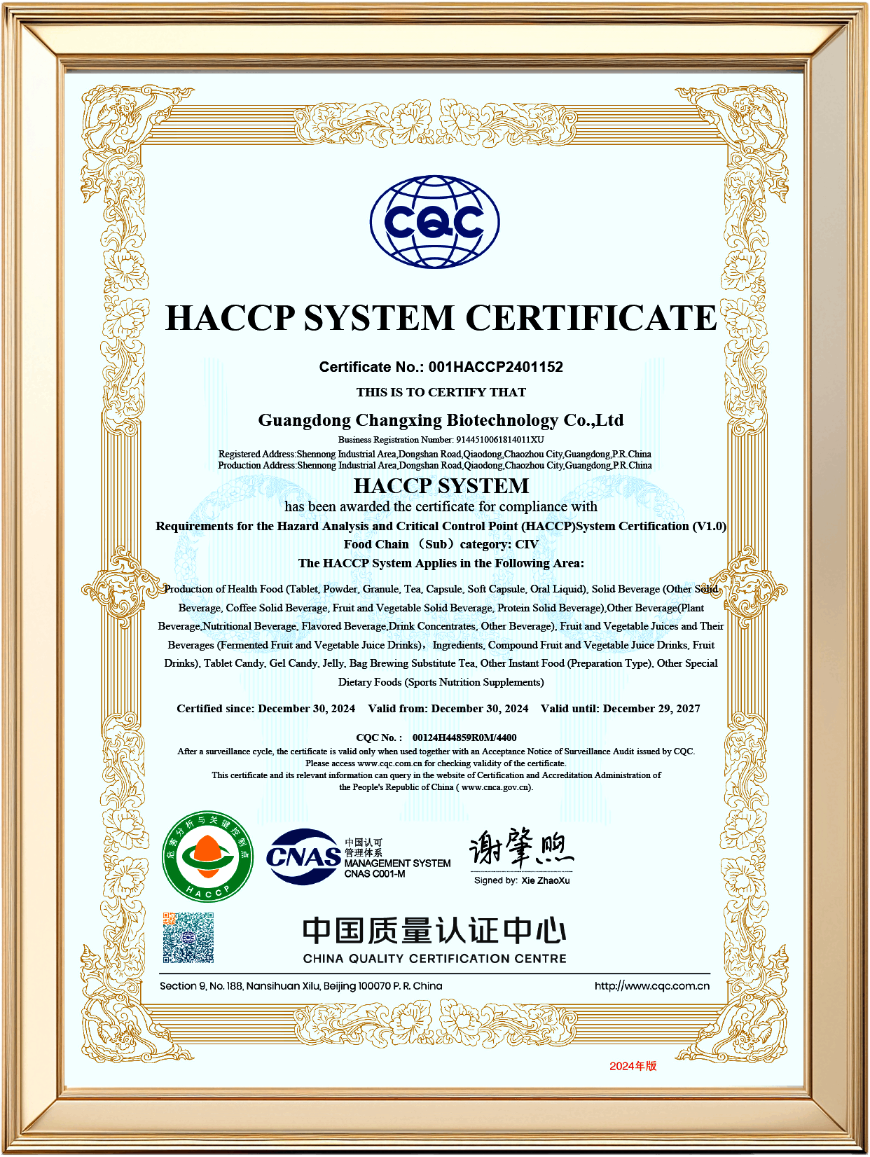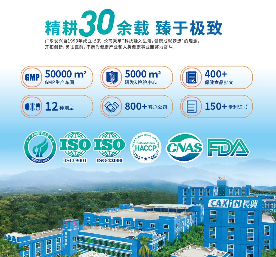 Guangdong Changxing Biotechnology Co., Ltd. (referred to as "CAXiN Biotech"), with the brand logo of CAXiN, was established in 1993 as a Sino-foreign joint venture. Having been deeply engaged in the big health industry for more than 30 years, it is a large-scale and modern comprehensive big health industry group rooted in national high-tech, integrating the R&D, production and sales of health food, dietary nutrient fortified food, functional food and other products. It is committed to becoming an advanced manufacturer in the global health industry and can provide professional OEM (Original Equipment Manufacturer)/ODM (Original Design Manufacturer) services.